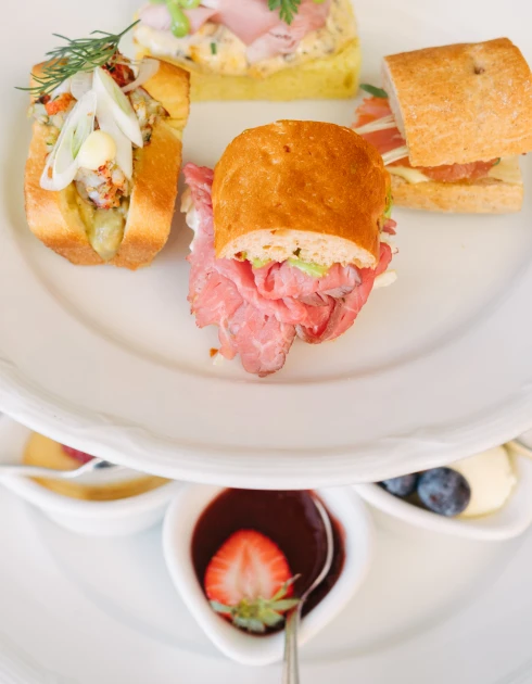 Selektion von Sandwiches, Scones mit Clotted Cream, Erdbeerkonfitüre und Lemon Curd, Selektion von Pâtisserie