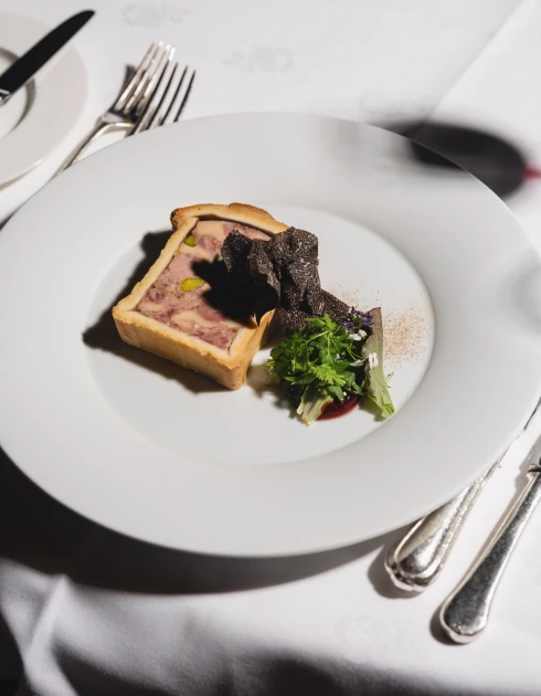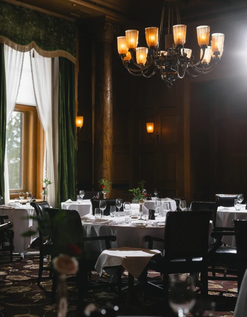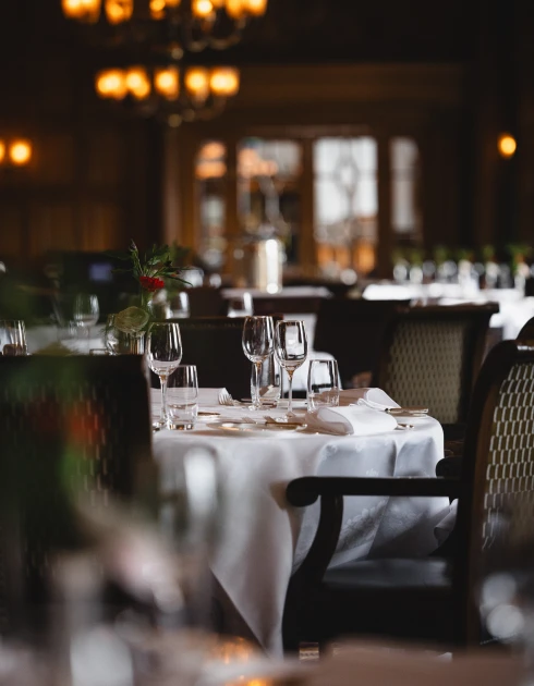 Gedämpftes Licht, hochwertige Täfelung, kunstvoll geschnitzte Säulen aus massiver Eiche und über allem eine aufwendig verzierte Kassettendecke: Der grosse Speisesaal atmet Geschichte. Hier zelebriert unser Küchenchef Fabrizio Zanetti seine Philosophie einer marktfrischen französischen Küche mit internationaler Note (17 Punkte GaultMillau).