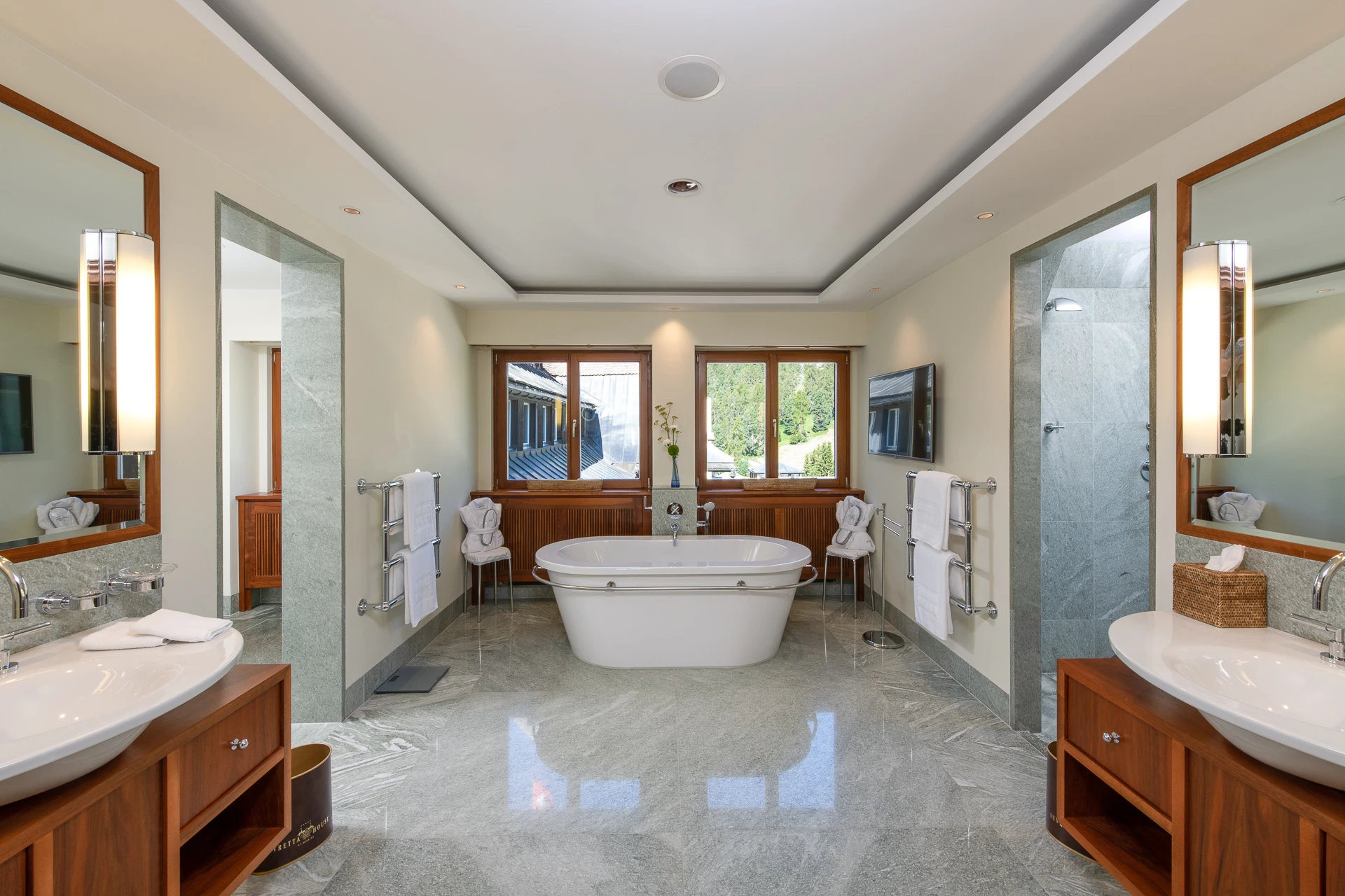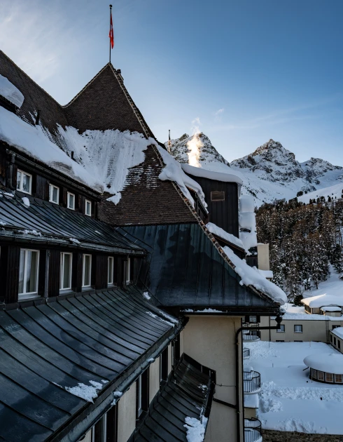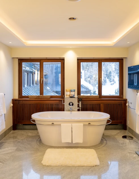 Diese ca. 90 m2 grosse, charmant eingerichtete und mit rustikaler Balkendecke versehende Suite in Nord-Ostlage bietet eine herrliche Aussicht auf das Ski- und Wandergebiet Corviglia. Sie verfügt über ein grosszügiges Wohnschlafzimmer mit Parkettboden, einen begehbaren Kleiderschrank und Designer-Badezimmer mit frei stehender Badewanne und grosser Dusche mit Blick auf den Suvrettahang.