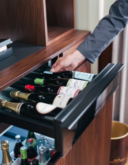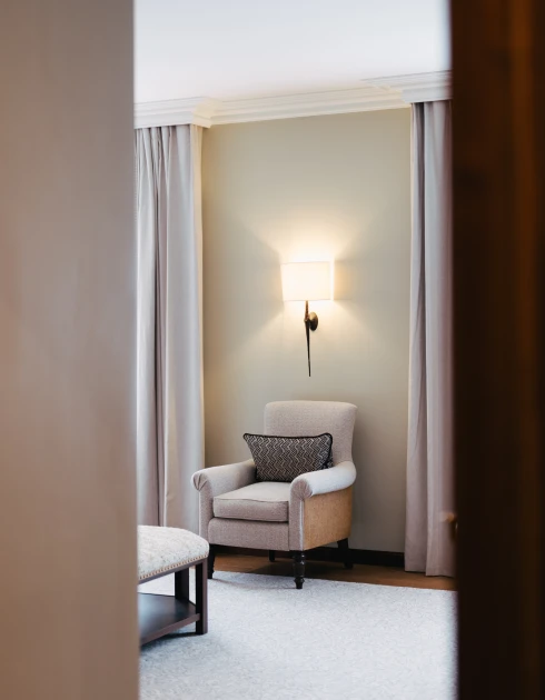 Eine Fläche von 100 m² inklusive eines repräsentativen Salons und einer aussergewöhnlichen Terrasse mit Blick auf die Engadiner Seenlandschaft wird allen Erwartungen gerecht. Die Suite begeistert mit einem luxuriös ausgestatteten Wohnzimmer, separatem grosszügigen Schlafraum und zwei geräumigen Badezimmern.