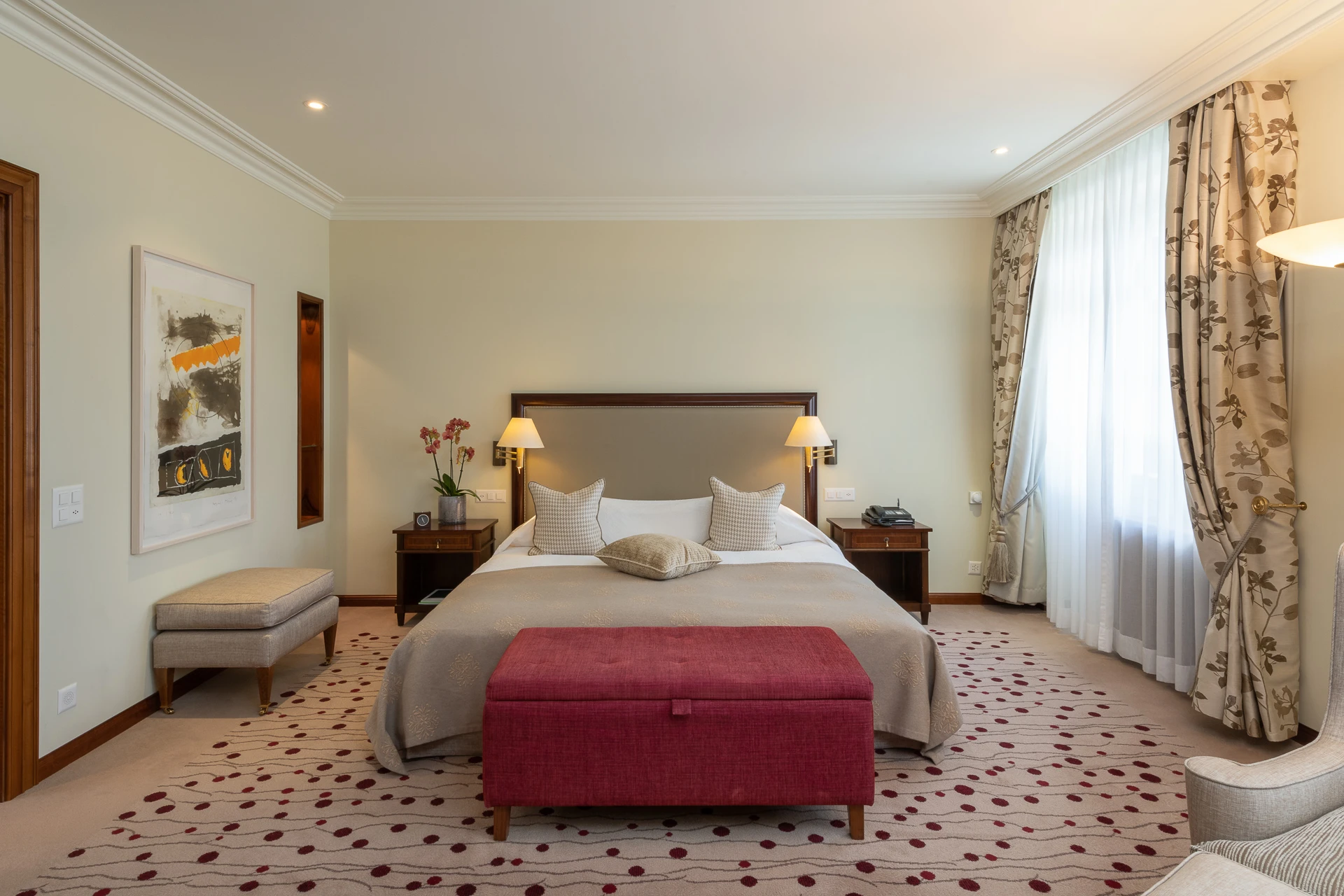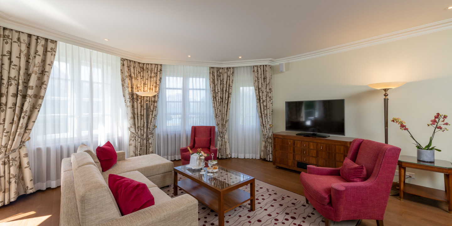Diese ca. 130 m2 grosse, lichtdurchflutete und hochwertig eingerichtete 2-Zimmer-Suite in Südlage bietet eine herrliche Aussicht auf Seen und Berge. Sie verfügt über einen luxuriösen Salon, ein grosszügiges Schlafzimmer, zwei Badezimmer inklusive separat begehbarer Dusche und grosser Sonnenterrasse.
